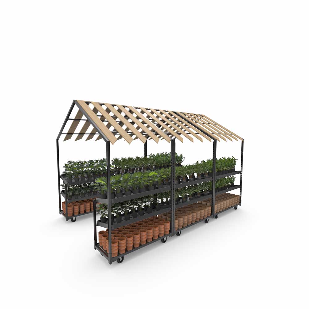 The greenhouse roof creates an open and airy look,with the wooden shelves placed in such a way that enough daylight comes through. clear arrangement of plants, pots or decorative items. Modular, linkable, easy to move.