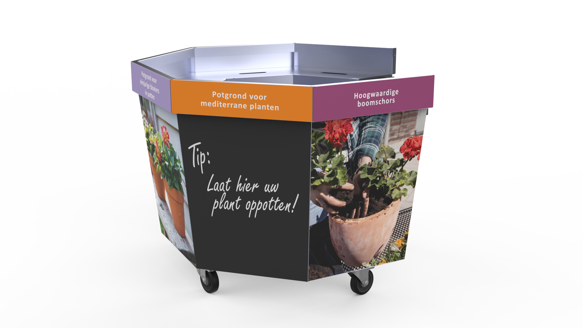 The Horti-Bar is ideally suited for presenting various types of potting soil, while at the same time, as an extra service, immediately potting up your customer's plants with the right soil.